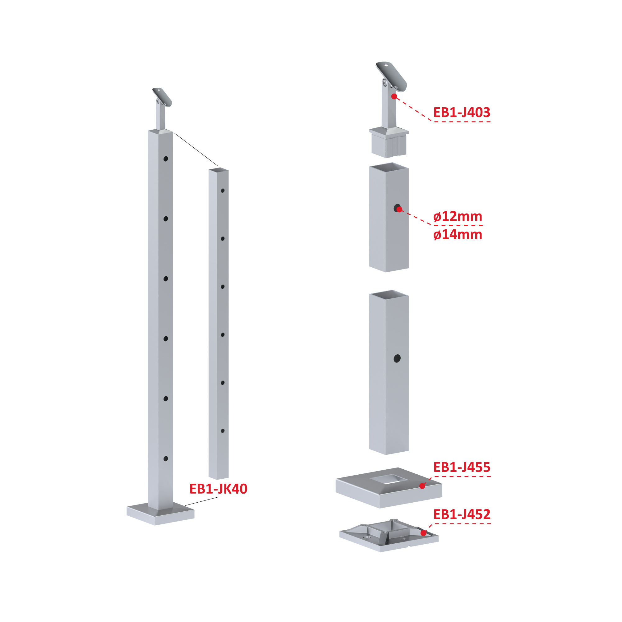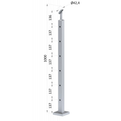 Nerezový stĺp, vrchné kotvenie, 6 dierový priechodný, vrch nastaviteľný (40x40mm), brúsená nerez K320 /AISI304